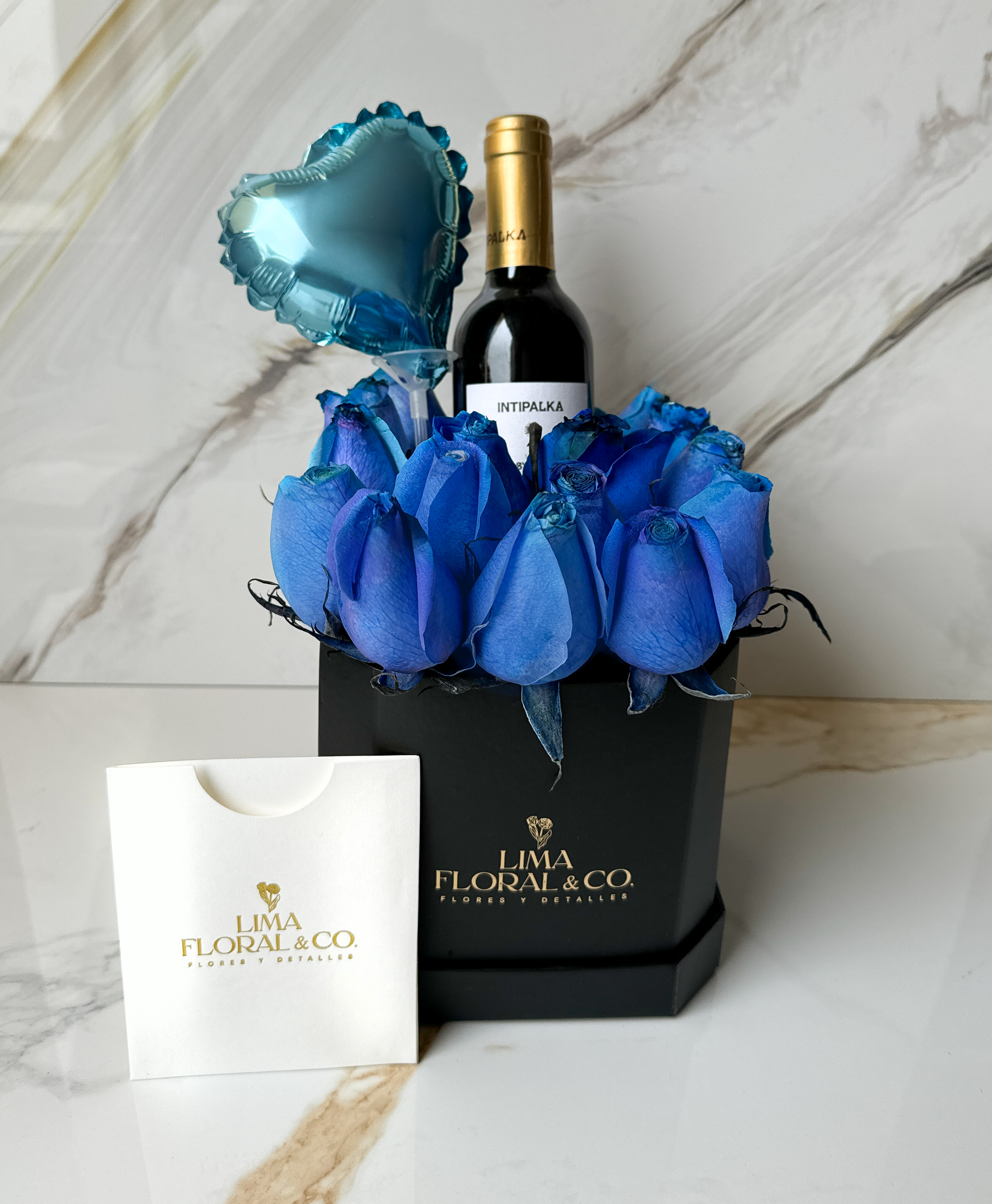 Mini Box con 17 rosas azules y una botella de vino Intipalka x 375 ml, incluye globo y nuestra elegante papelería de marca con tarjeta de dedicatoria personalizada.