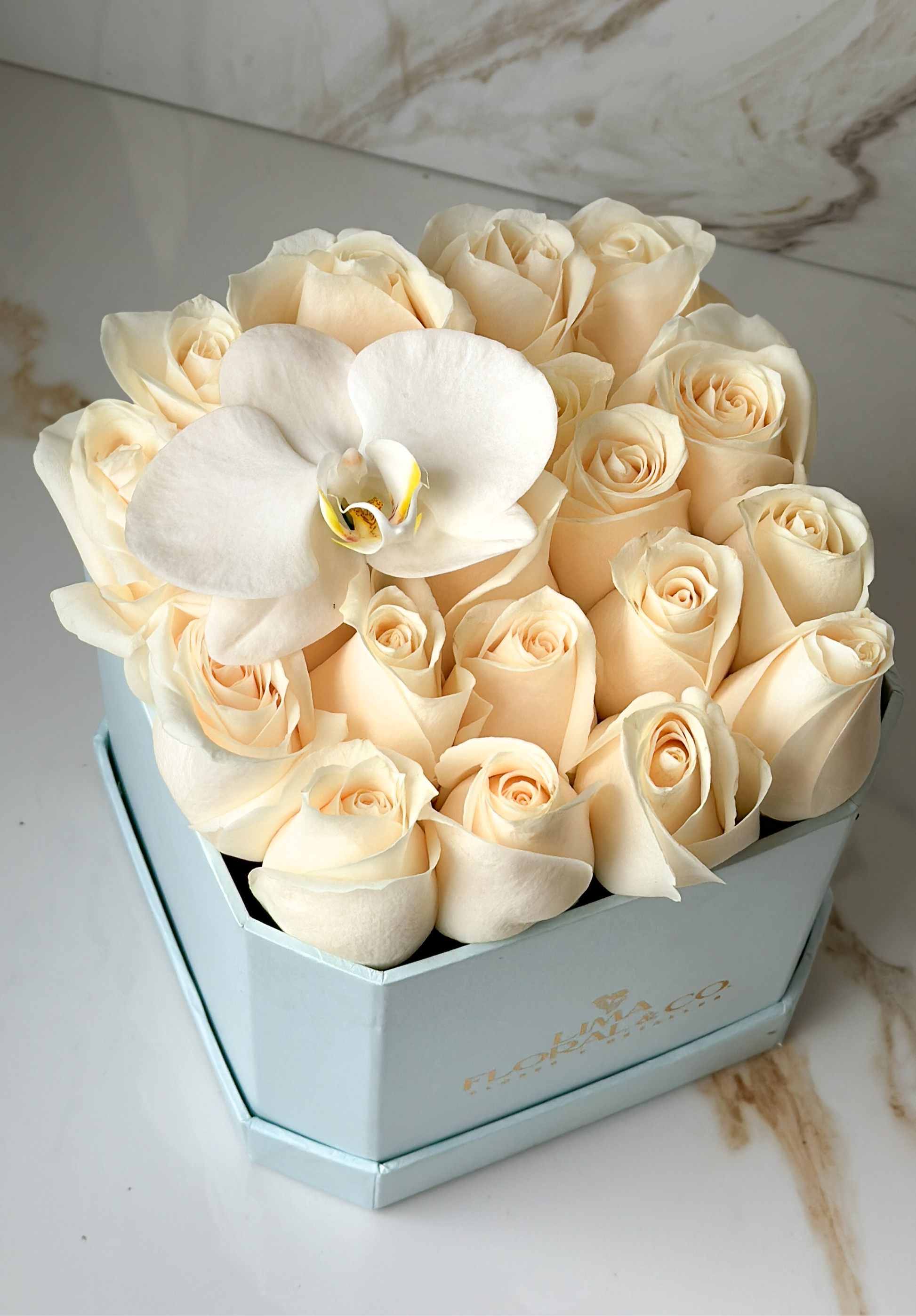 20 rosas importadas y una linda orquídea. Incluye globo metálico, tarjeta de dedicatoria y papelería de la marca. Un detalle sofisticado y especial.