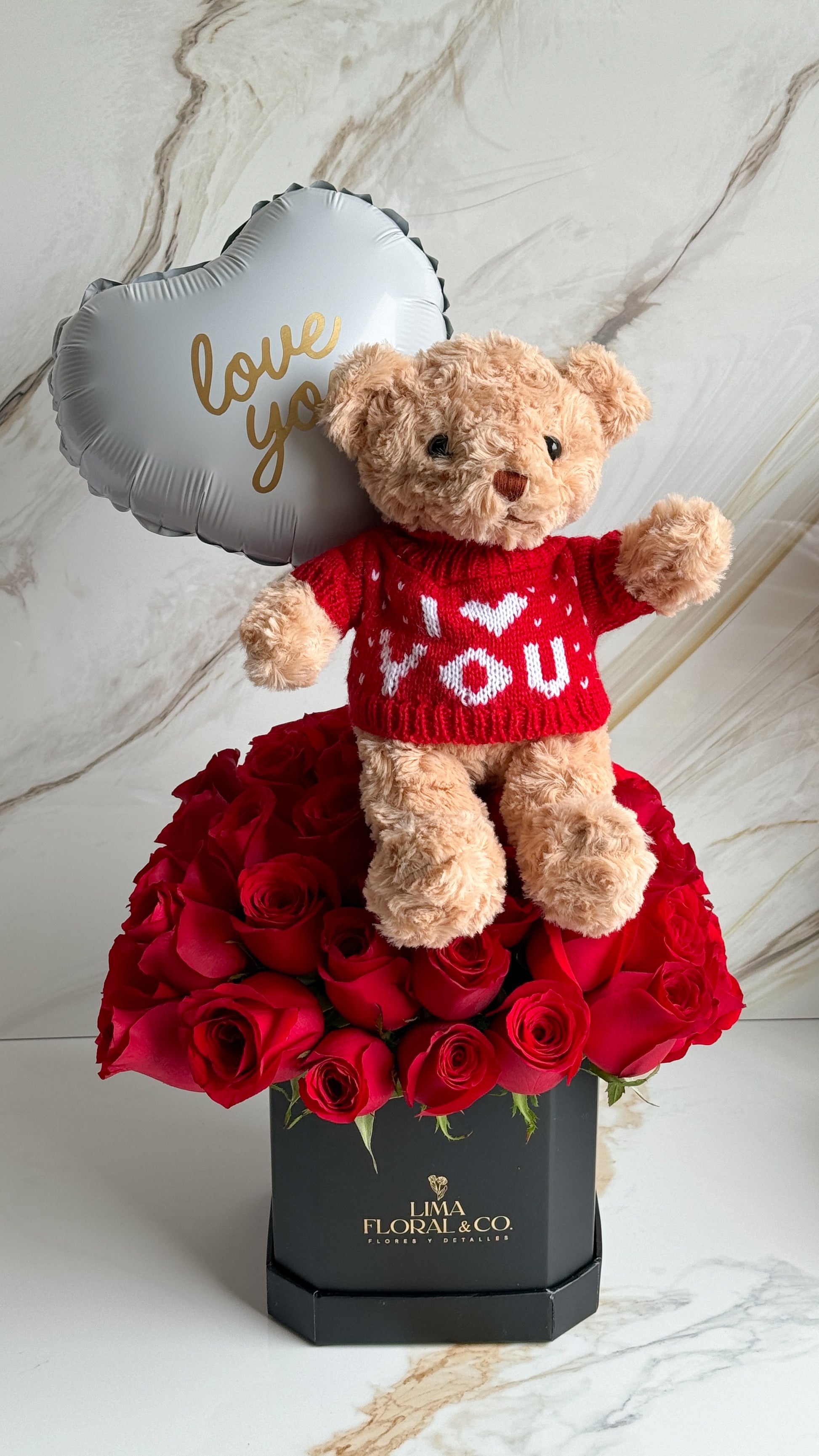 El pack perfecto, la versión mini de nuestro Luxury Box de 40 Rosas acompañado de un tierno osito y un globo personalizable.