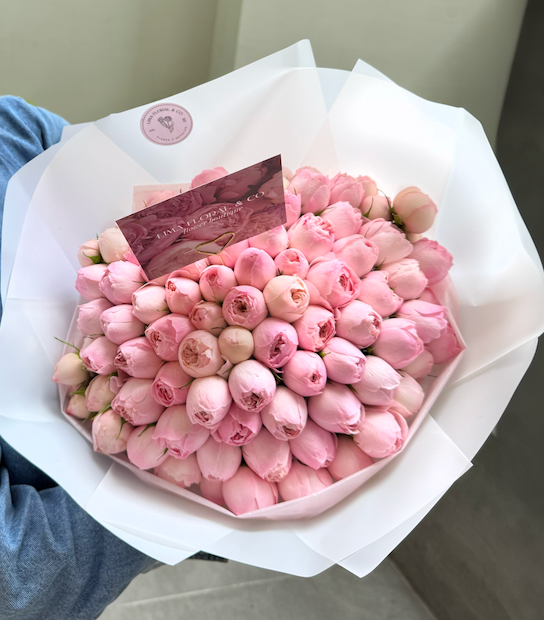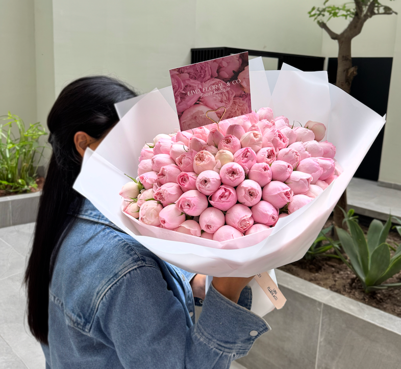 Un bouquet diseñado para dejar sin palabras. Este ramo reúne 100 rosas inglesas rosadas (mini peonias), cuidadosamente seleccionadas por su forma romántica y su forma única. Perfecto para grandes declaraciones de amor, aniversarios inolvidables o celebraciones que merecen ser eternas. Un diseño imponente y lleno de elegancia, este arreglo no solo enamora: impacta, emociona y queda en la memoria.