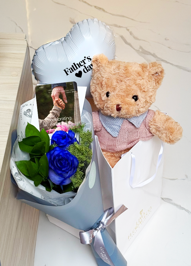 Un detalle pequeño, pero lleno de cariño. Incluye 2 rosas frescas (puedes elegir el color) y un osito con mensaje especial para papá. Ideal para decir “Estoy pensando en ti” de una forma dulce y diferente. 💙🐻