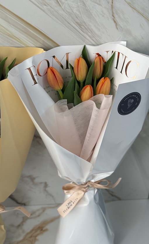 Nuestro elegante Ramo de 5 Tulipanes está diseñado para impresionar y alegrar cualquier ocasión. Compuesto por tulipanes frescos, complementados con un fino follaje.