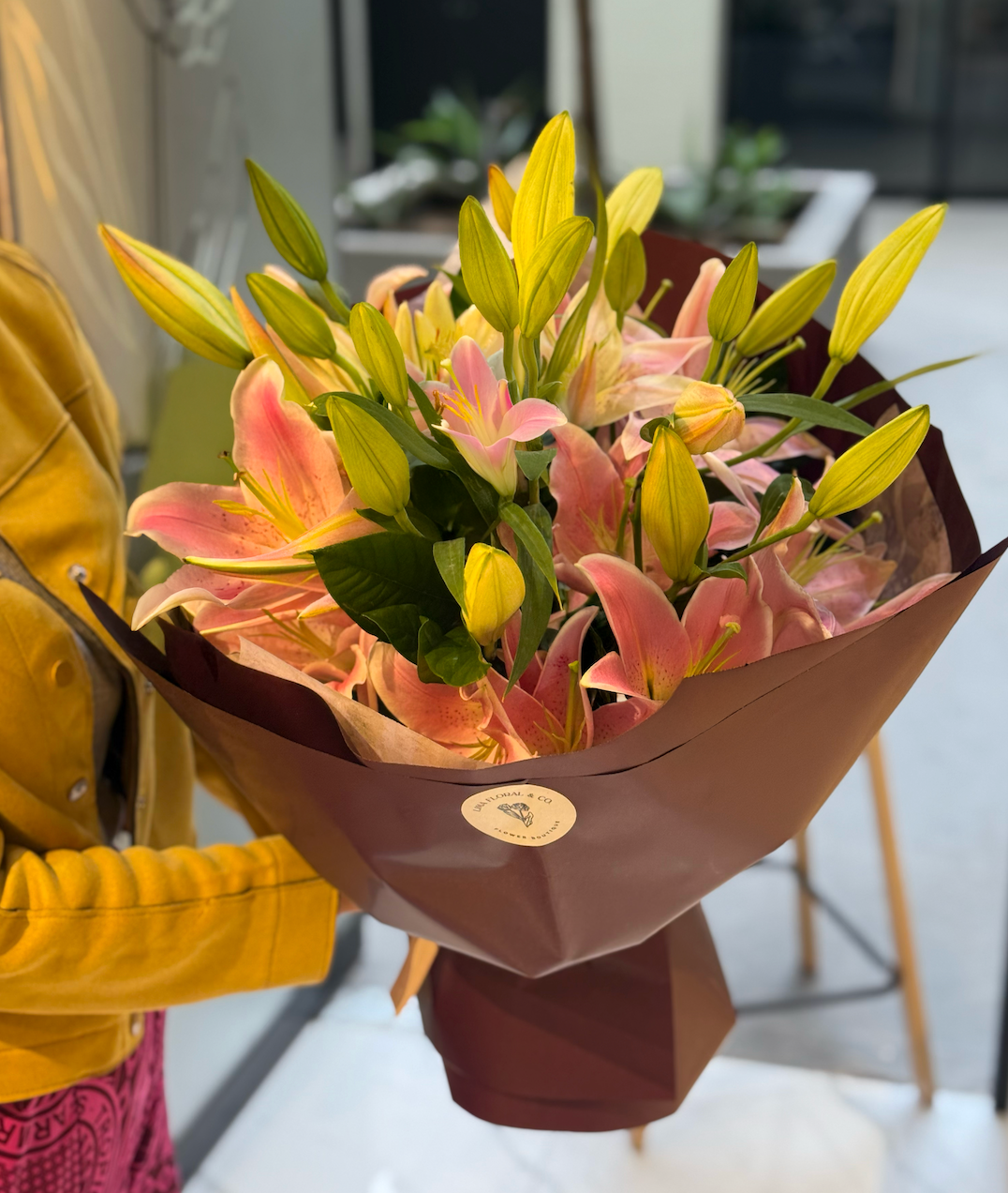 Ramo grande de 10 varas de lirio rosa, donde cada vara presenta entre 2 y más flores.