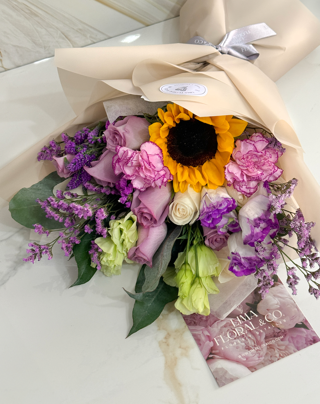 Lleno de frescura y color, este ramo combina 8 rosas en tonos blancos y morados, lisianthus, claveles y un girasol para iluminar cualquier día. Con un globo y tarjeta de dedicatoria, es una elección perfecta para sorprender con estilo y variedad.
