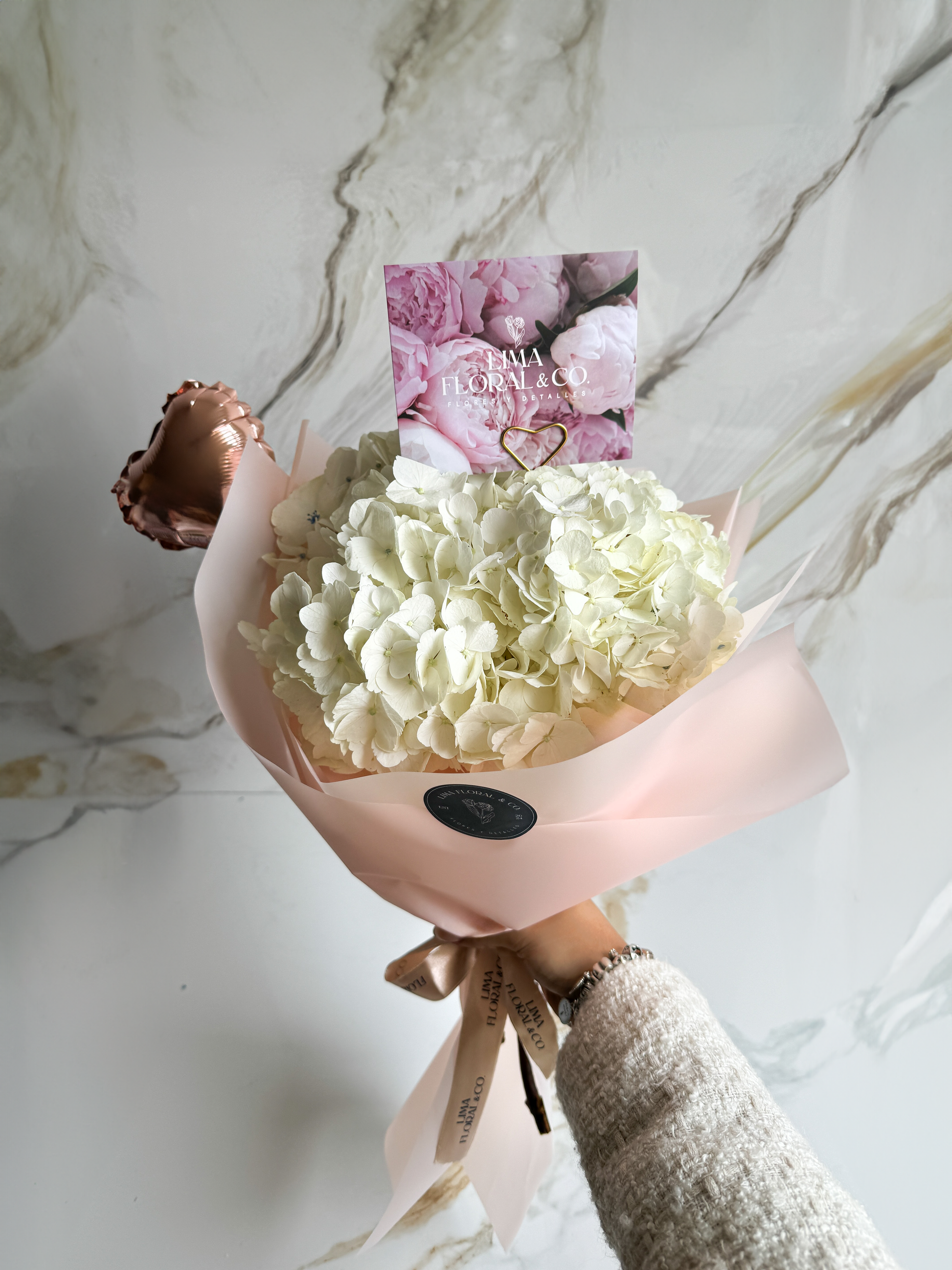 Un delicado ramo de hortensias blancas, ideal para cualquier ocasión especial. Incluye un globo y nuestra exclusiva papelería de marca con tarjeta de dedicatoria personalizada.
