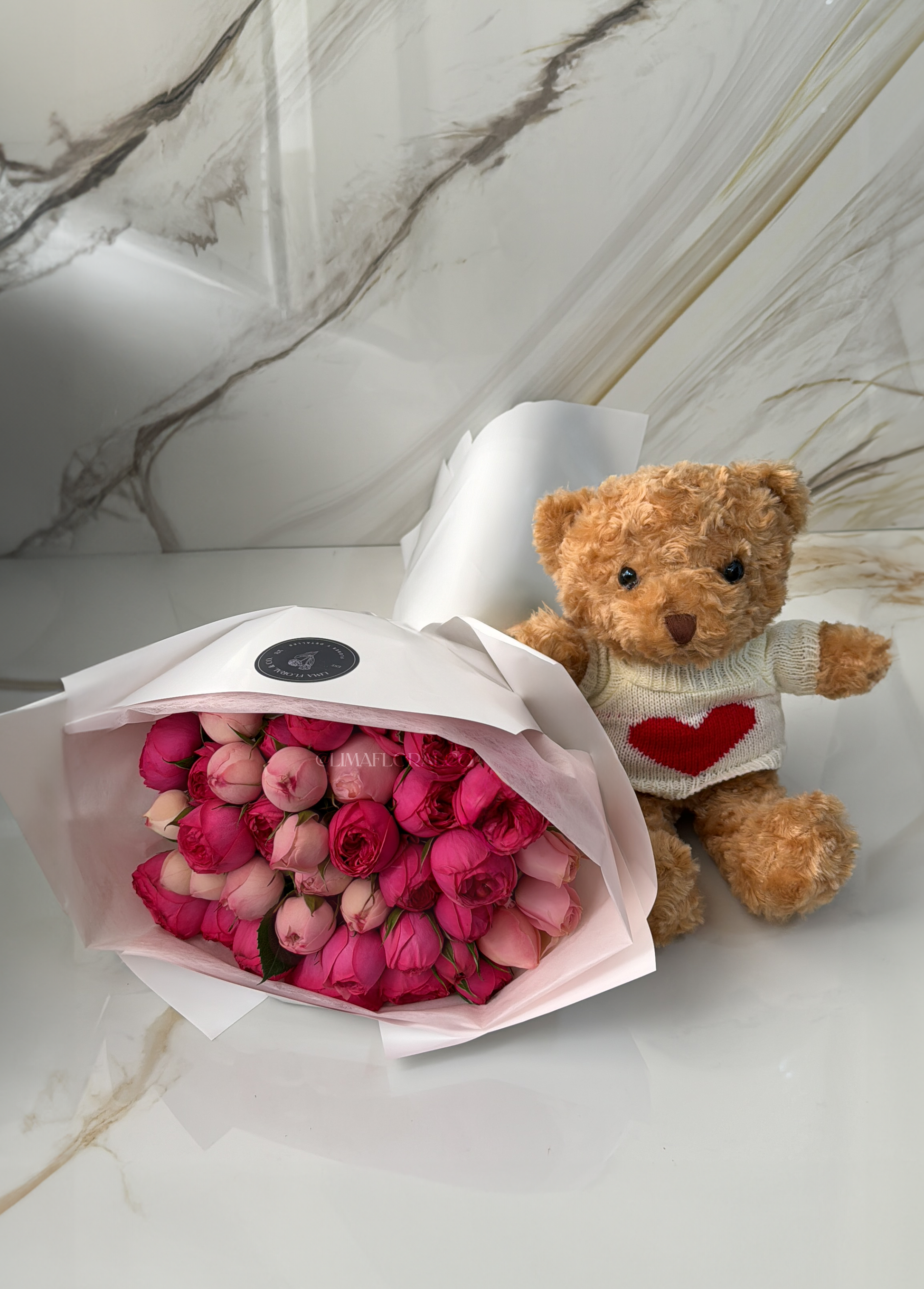 Un mix chic de mini peonias/rosas inglesas rosadas y fucsias acompañado de un dulce osito teddy (Segun stock de de modelo). Incluye globo personalizado y tarjeta de dedicatoria. Un ramo diseñado para enamorar y encantar.