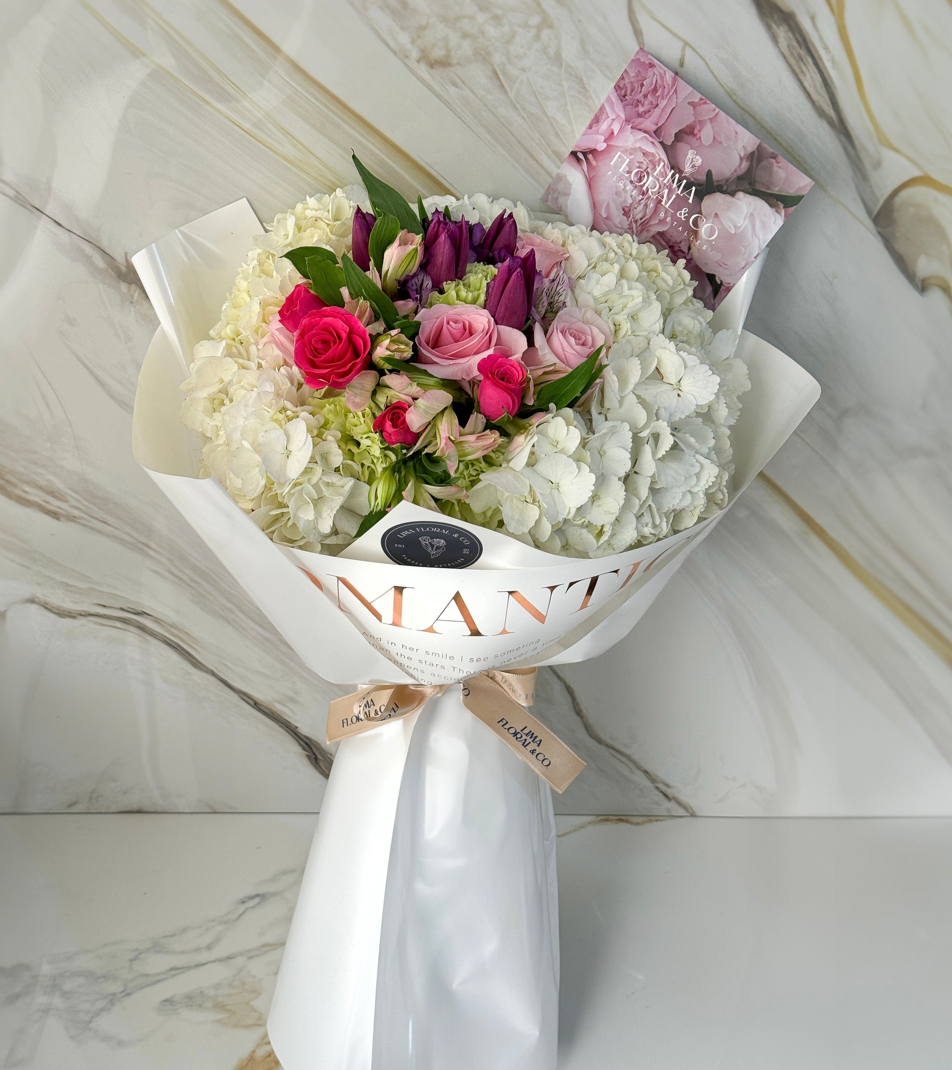 Perfecto para sorprender en cualquier ocasión, el ramo Emilia combina un mix de flores premium: hortensias, mini rosas, astromelias, tulipanes, rosas y claveles importados.