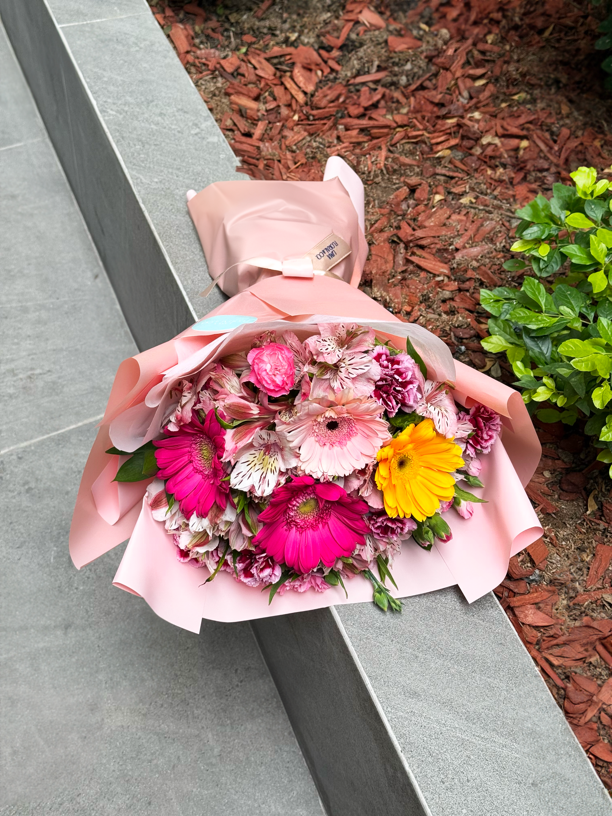 Ramo Gemma: astromelias, mini claveles y gerberas coloridas.
