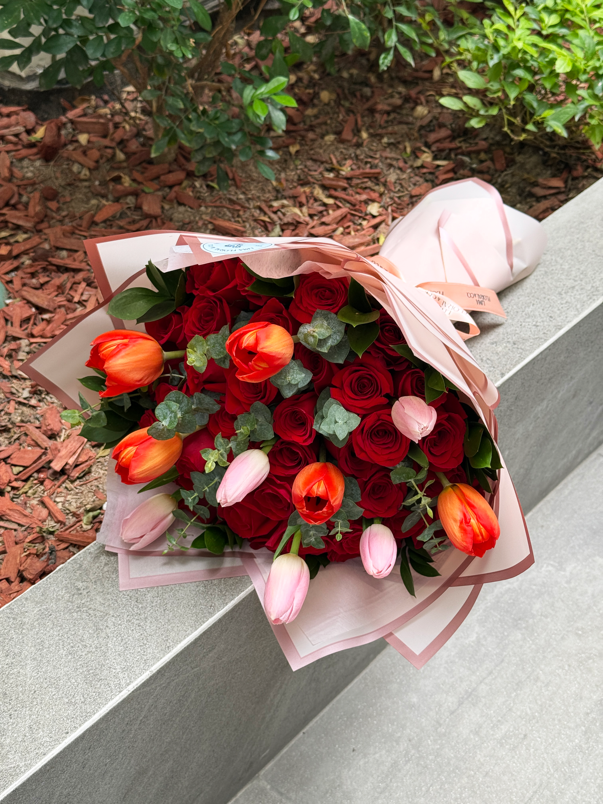 40 elegantes rosas rojas y 10 tulipanes coloridos.