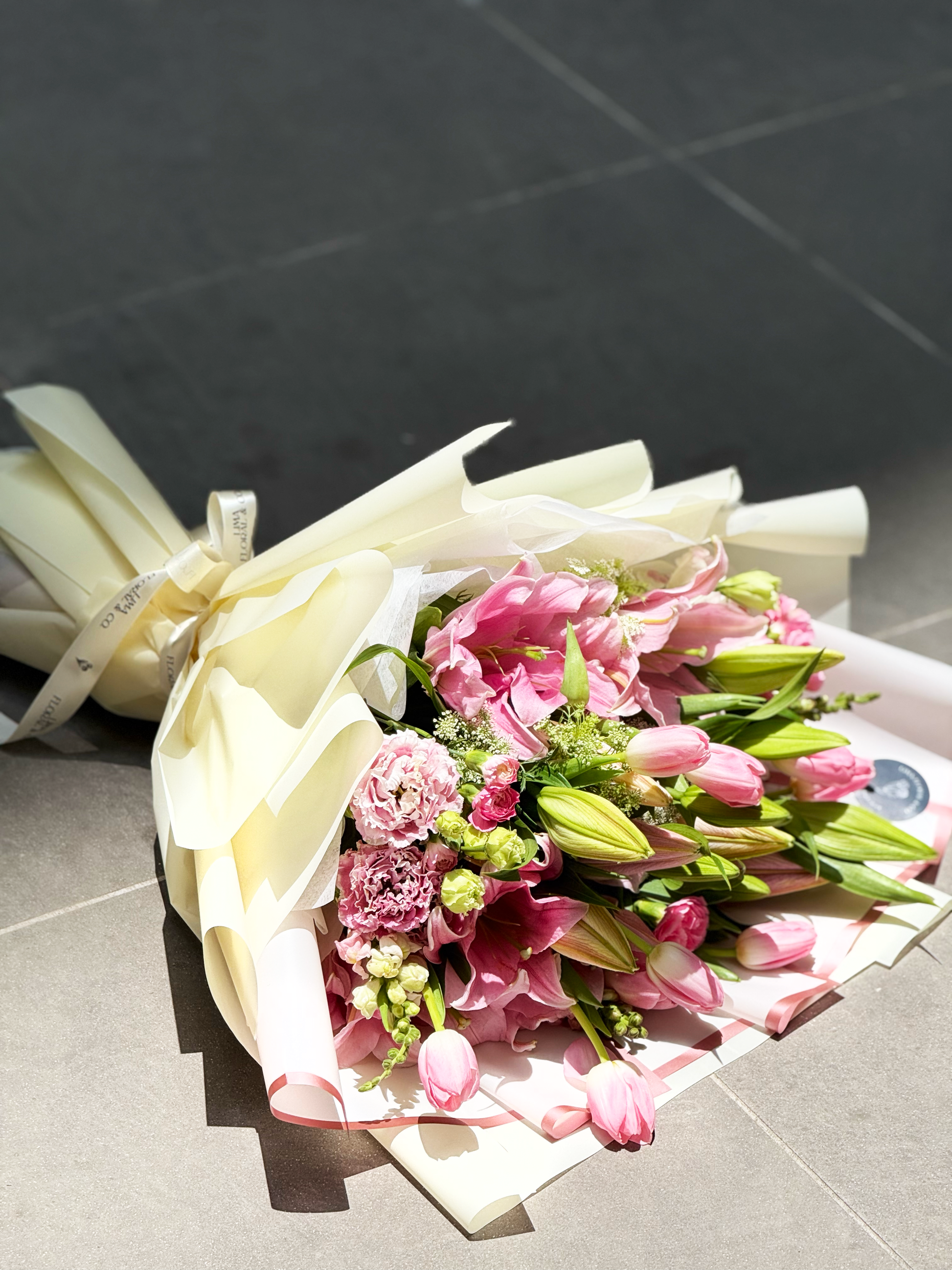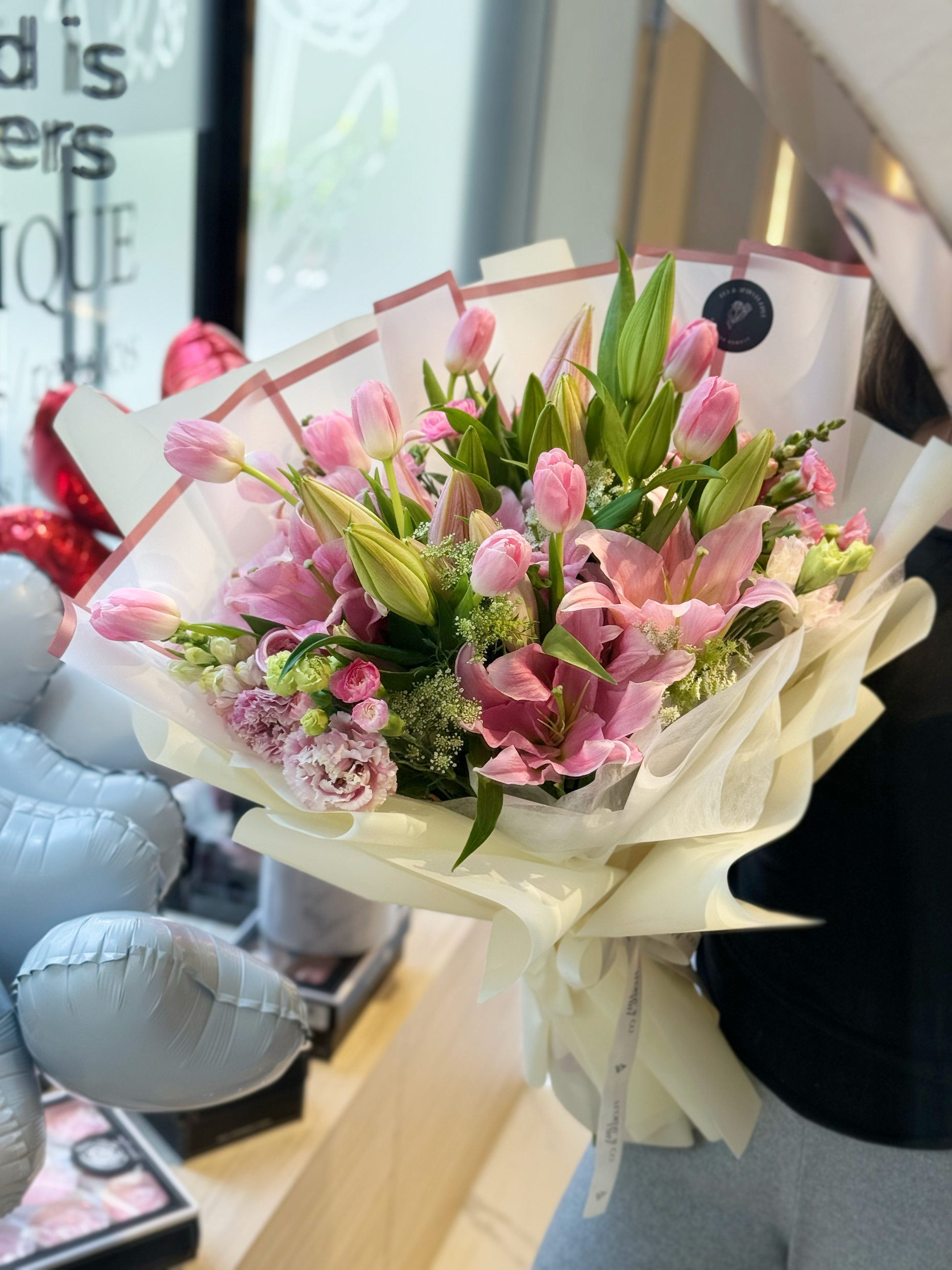 Una combinación única de flores premium en tonos rosados suaves: lirios elegantes y tulipanes frescos en su mejor punto. Un diseño de gran tamaño que transmite delicadeza, romanticismo y elegancia.