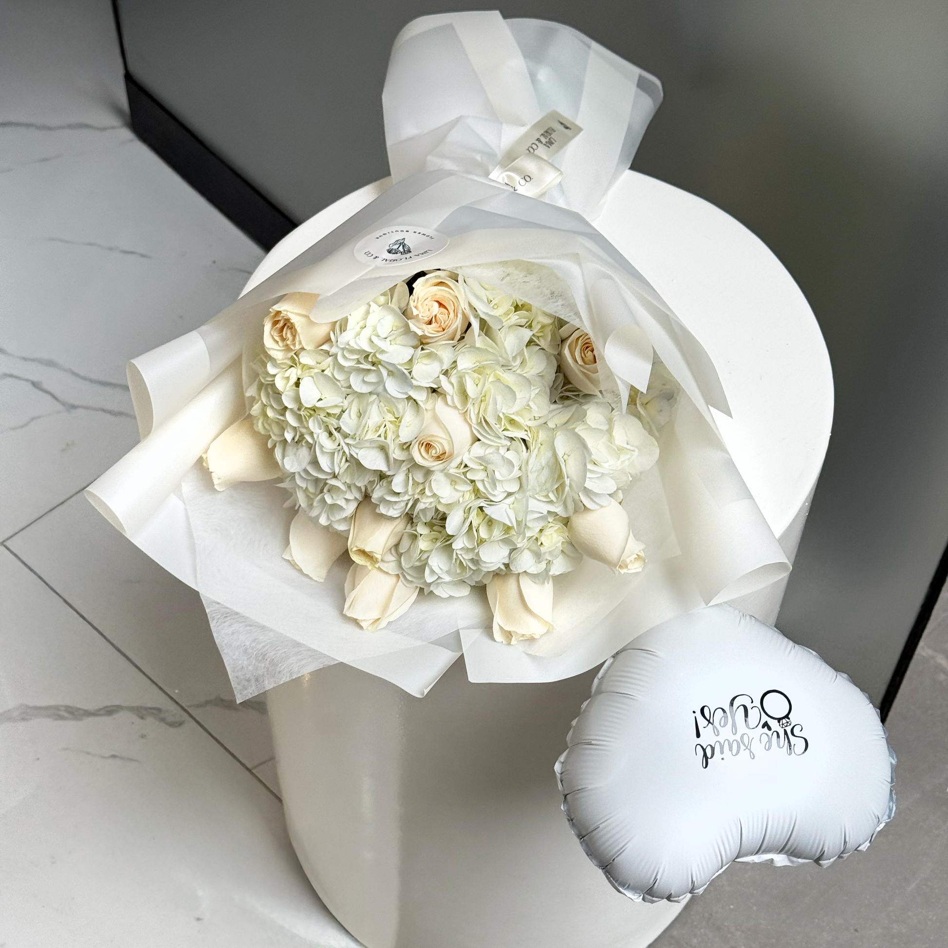 Hortensias de vivero y rosas blancas.
