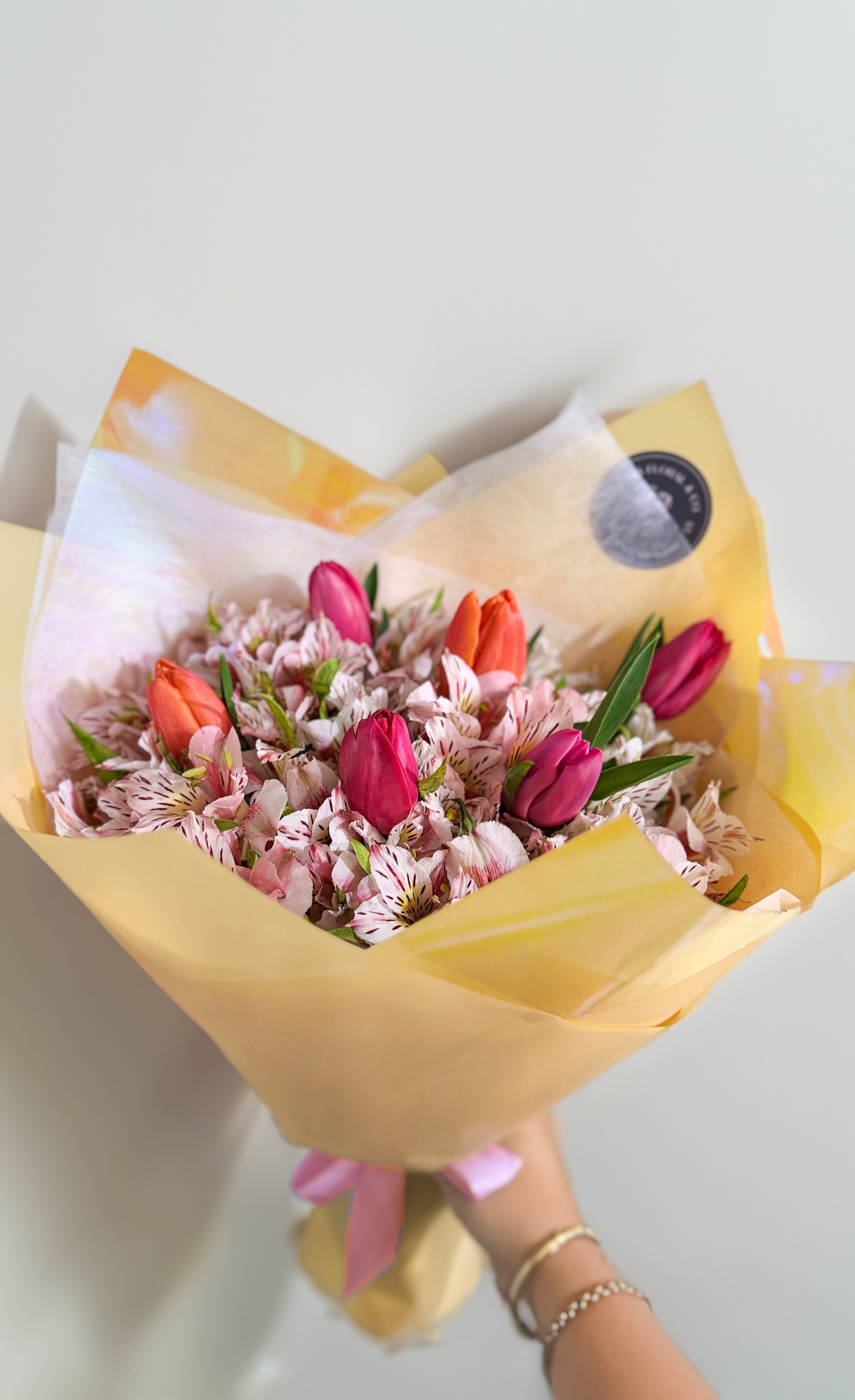 Cinco vibrantes tulipanes multicolor y frescas astromelias que iluminan el día. Un ramo delicado y alegre que transmite aprecio y buenos deseos en cualquier ocasión.