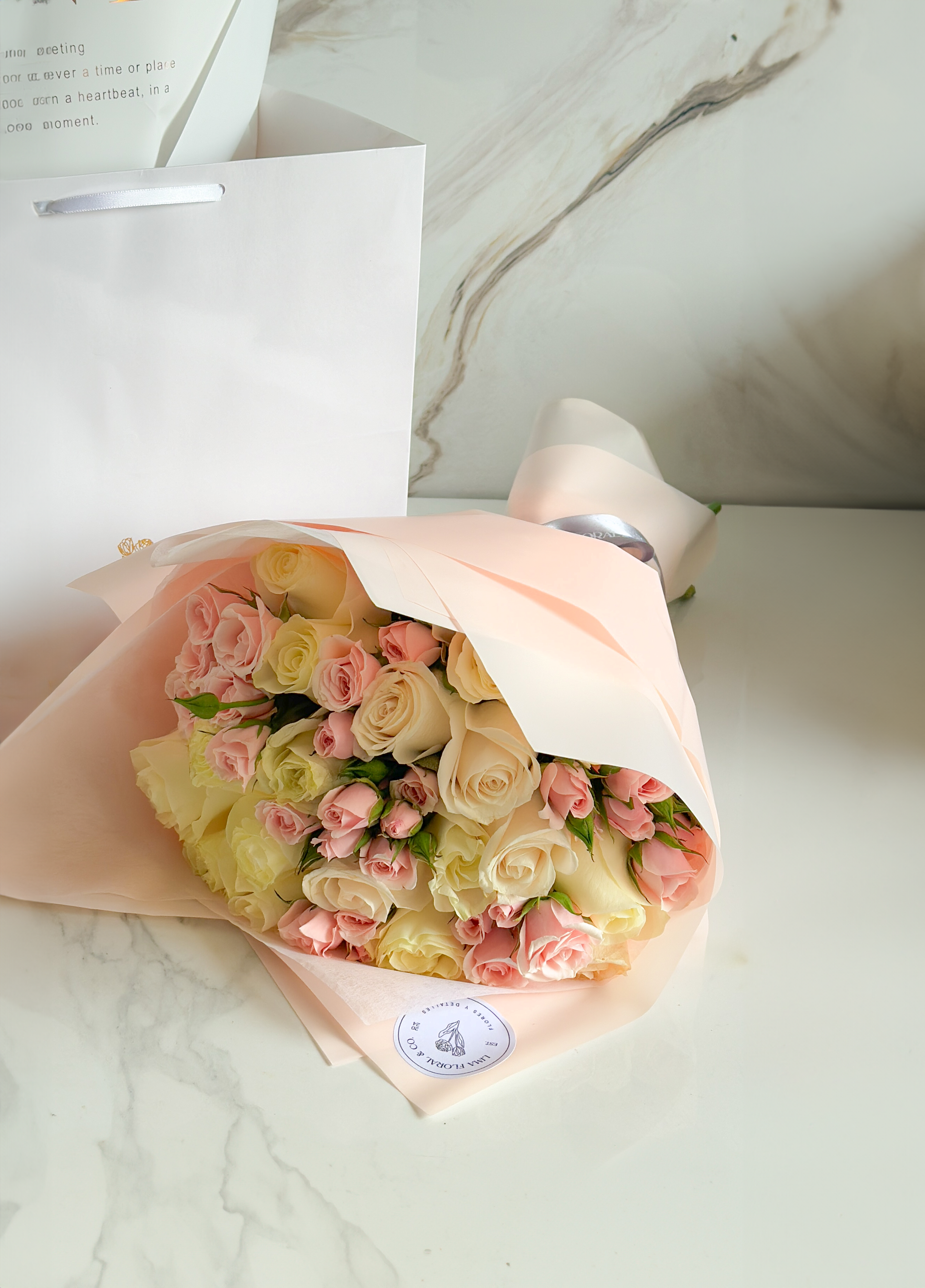 Un delicado ramo de rosas blancas combinadas con mini rosas en tonos rosados pasteles, ideal para expresar dulzura y elegancia en cualquier ocasión. Perfecto para aniversarios, cumpleaños o simplemente para alegrar el día de alguien especial.