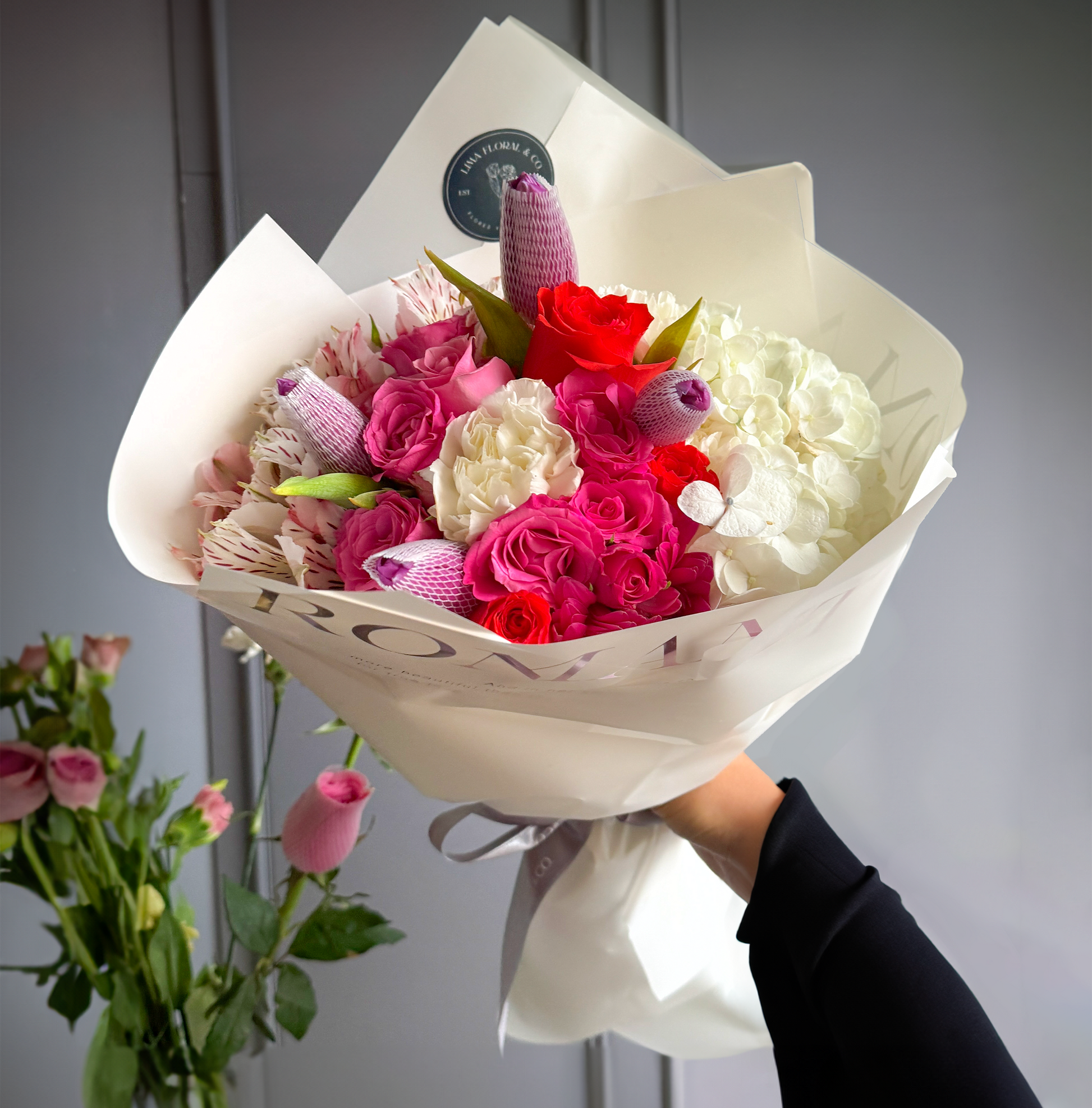 - Composición floral: tulipanes, hortensias, claveles, astromelias y rosas