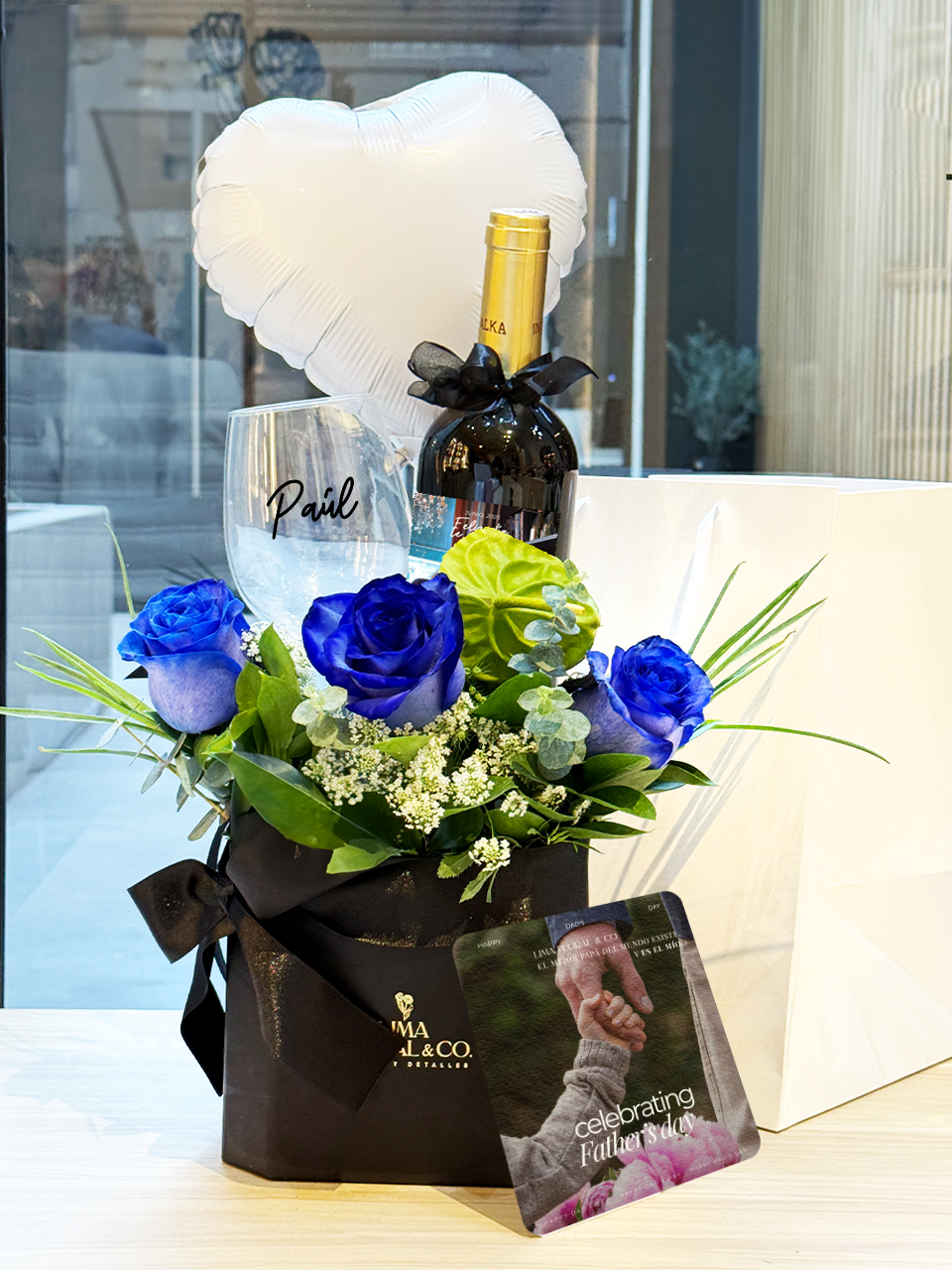 Incluye rosas azules, anturios y follaje verde en una base elegante, acompañado de un vino personalizado con su foto y una copa grabada con su nombre (o globo personalizado, a elección).